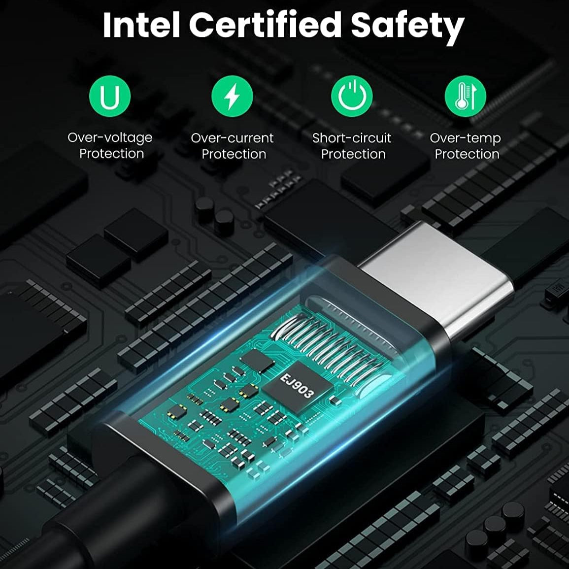 آمن معتمد من Intel: يضمن كابل UGREEN Thunderbolt 4 الموثوقية والمتانة، بما في ذلك الحماية المدمجة من الجهد الزائد، وحماية التيار الزائد، وحماية الدائرة القصيرة، وحماية درجة الحرارة الزائدة.