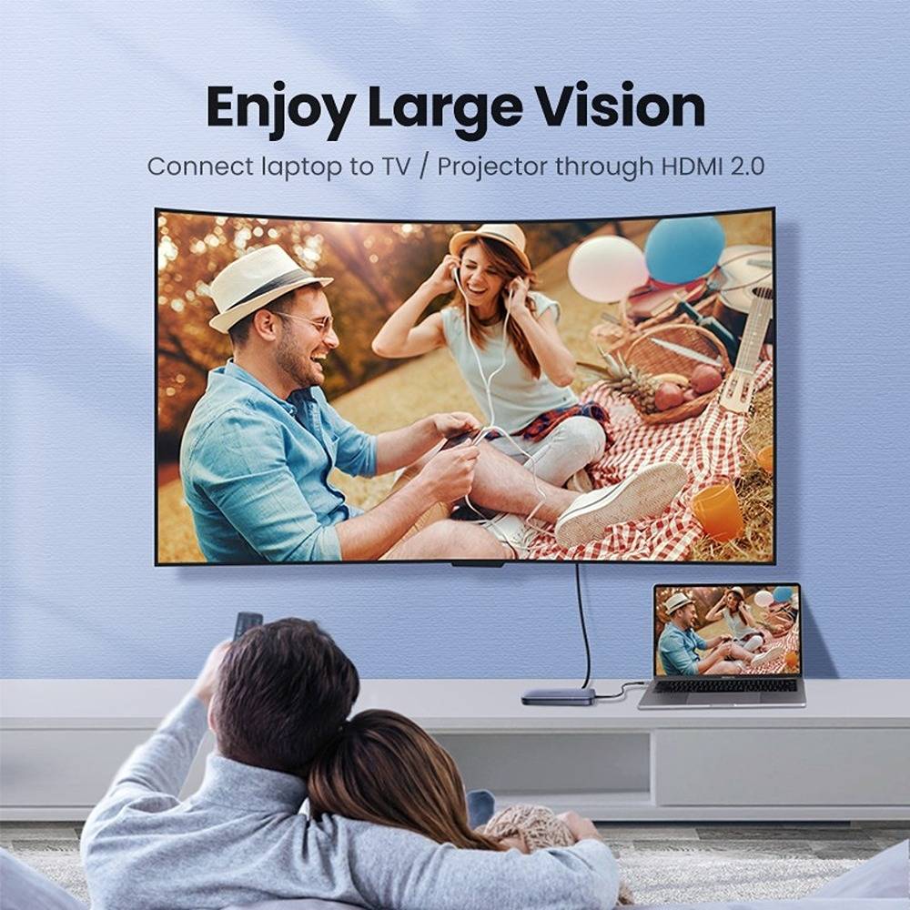 محول UGREEN من النوع C إلى HDMI مزود بمنفذ USB C لتوصيل الطاقة، مما يسمح لك بشحن أجهزتك أثناء العمل أو الترفيه، ولا تقلق أبدًا بشأن انقطاع الطاقة.