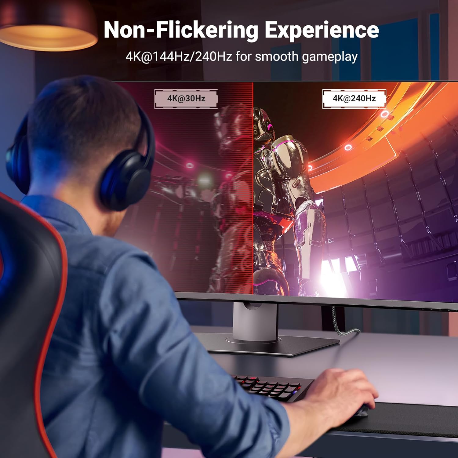 - نقل محسّن بمنفذ DisplayPort 1.4: ينقل إصدار DP 1.4 البيانات بسرعات تصل إلى 32.4 جيجابت في الثانية و240 هرتز. بفضل نقل الإشارة المستقر، يمكن لكابل USB C إلى DP ضمان جودة صوت وصورة مذهلة، ونهاية لوميض الشاشة. يدعم HDCP2.3 ومعدل التحديث المتغير (VRR) ووضع زمن الوصول المنخفض التلقائي (ALLM) الذي يمنحك تجربة لعب أكثر سلاسة. كما يدعم الصوت الخالي من العيوب بما في ذلك eARC وDTS وDolby. من خلال هذا، يمكنك الحصول على وليمة مشاهدة غامرة