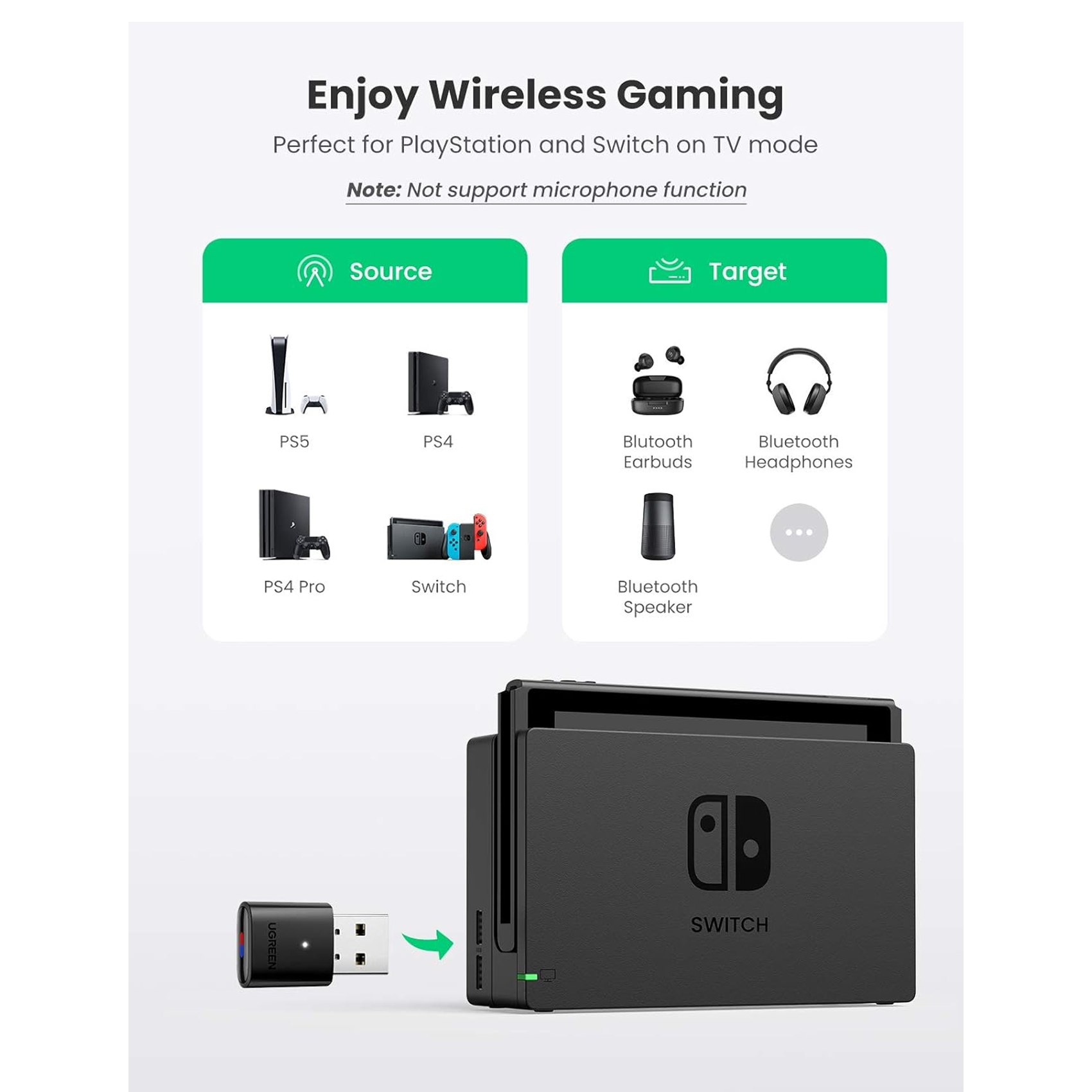 محول بلوتوث الإصدار 5.0 : يُتيح لك جهاز إرسال الصوت UGREEN Bluetooth أسهل طريقة لإضافة بلوتوث إلى أجهزة Switch / PS5 / PS4 / PS4 Pro / PS3. بفضل تقنية Bluetooth 5.0، يُمكنك توصيل سماعات الرأس المفضلة لديك لتشغيل الألعاب، ويدعم اتصالاً مستقراً لمسافة 33 قدماً دون أي تأخير. ملاحظة: لا يدعم الميكروفون، وينقل إشارات الصوت فقط لتوصيل الأجهزة الصوتية.